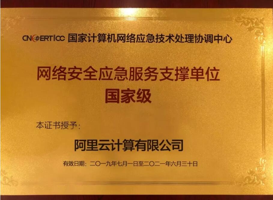 7月17日,阿里云入选由国家互联网应急中心CNCERT颁发的国家级网络安全应急服务支撑单位,是唯一入选的云服务商。
